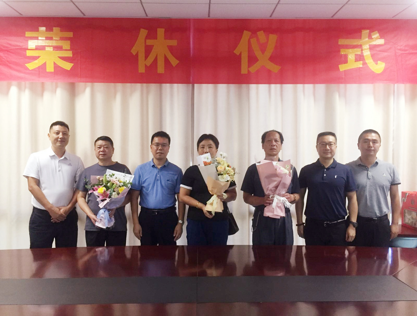 在庞宪洪处长带领下,处领导为三位荣休教职工送上了鲜花和礼品并合影,祝愿他们退休生活如鲜花般多姿多彩。全体后勤人自发起立用热烈的掌声欢送他们离开仪式现场。