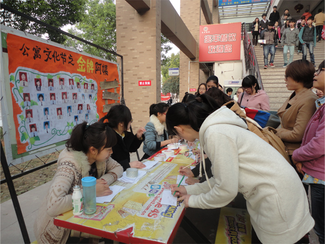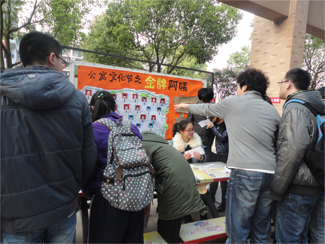 本次活动主要内容是在参选的25名阿姨中选出12名金牌阿姨,力求这些被选上的金牌阿姨能作为典范,与学生一起共创寝室文明。经统计,最终1号楼周丽凤,2号楼常梅,3号楼徐杏菊,4号楼许美芳,5号楼陈君,7号楼梅婉婷,8号楼林青,9号楼蔡菊芳,10号楼王玉琴,11号楼邹小燕,12号楼苏美红、杨文娟阿姨在本次活动中脱颖而出,荣获本届“金牌阿姨”的称号。其中12号楼的苏美红阿姨更是以230票的最高票数遥遥领先。