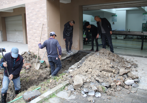 在抢修现场,维修人员通过测漏仪逐处检测错综复杂的地下水管网,发现漏水原因是医化大楼北面与绿化带交接处地下水管接口开裂,漏水情况严重;另外还通过检测巡逻发现椒江校区4、5、6号教学楼消防喷淋有漏水现象。后勤人员克服各种困难抢修水管,以最快速度处理了漏水问题,并将开挖的地面平整,于21日完成抢修任务,现已恢复正常供水。