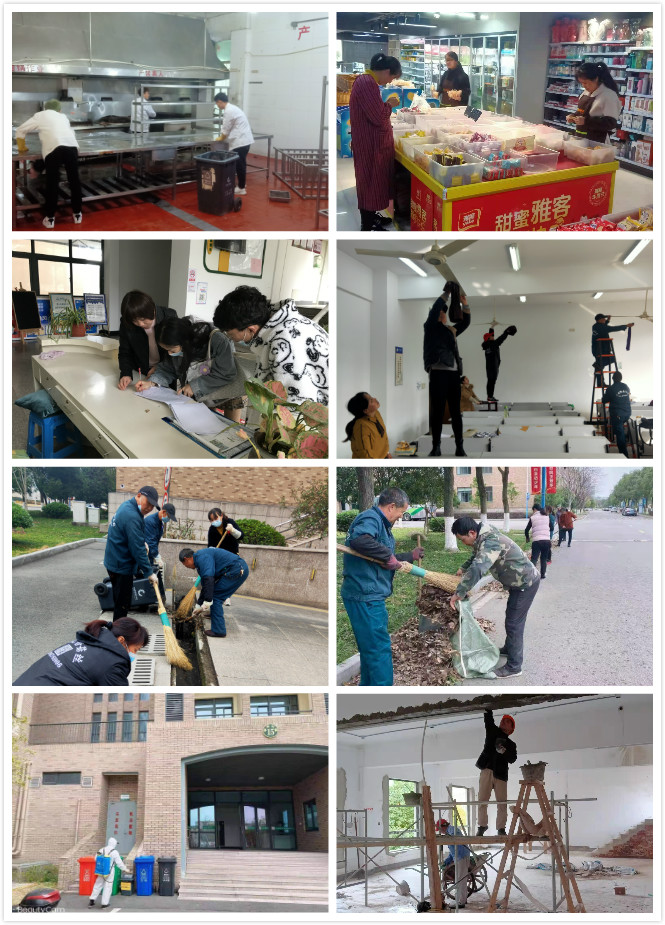 校后勤按照学校的统一部署和工作安排,将开学准备工作有条不紊地做细、做实,办公室根据学校开学防疫要求,全面精准排摸返校员工健康;餐饮中心组织人员彻底打扫食堂卫生,检修各项设施设备,严把食品安全关,同时精心布置食堂大厅,迎接师生们的到来;学生公寓中心提前做好公寓卫生打扫和设施设备检查维护,并贴心为每一间学生公寓开窗通风;水电维修中心在保证全校水电正常运行的同时,组织人员做好配电房检修及教学设施设备检修;校园环境中心加强校园卫生保洁,购置花草美化校园;商贸中心在做好文印、招待所、班车等综合服务的同时,提醒各商铺积极备货,保证开学采购高峰期师生放心选购;医务中心积极做好校园疫情防控工作,确保师生健康安全。