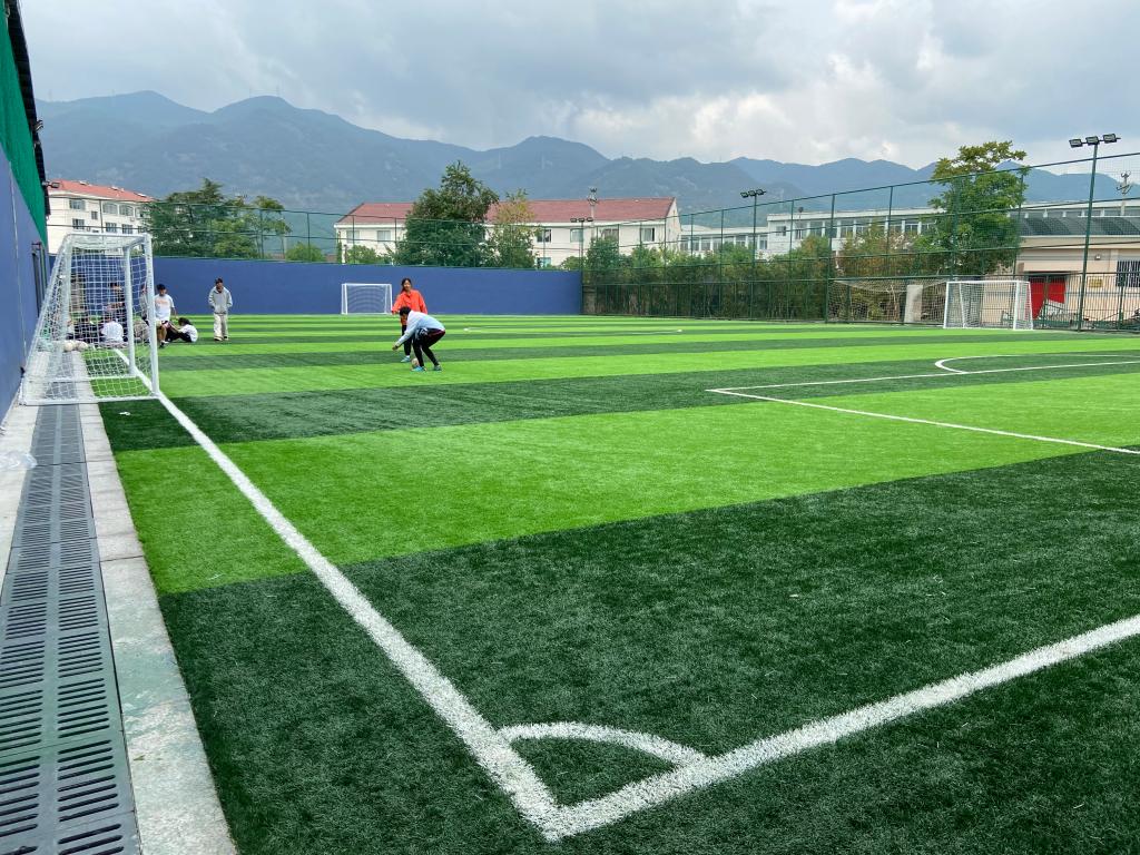 体育老师在改造一新的 7人制足球场上课