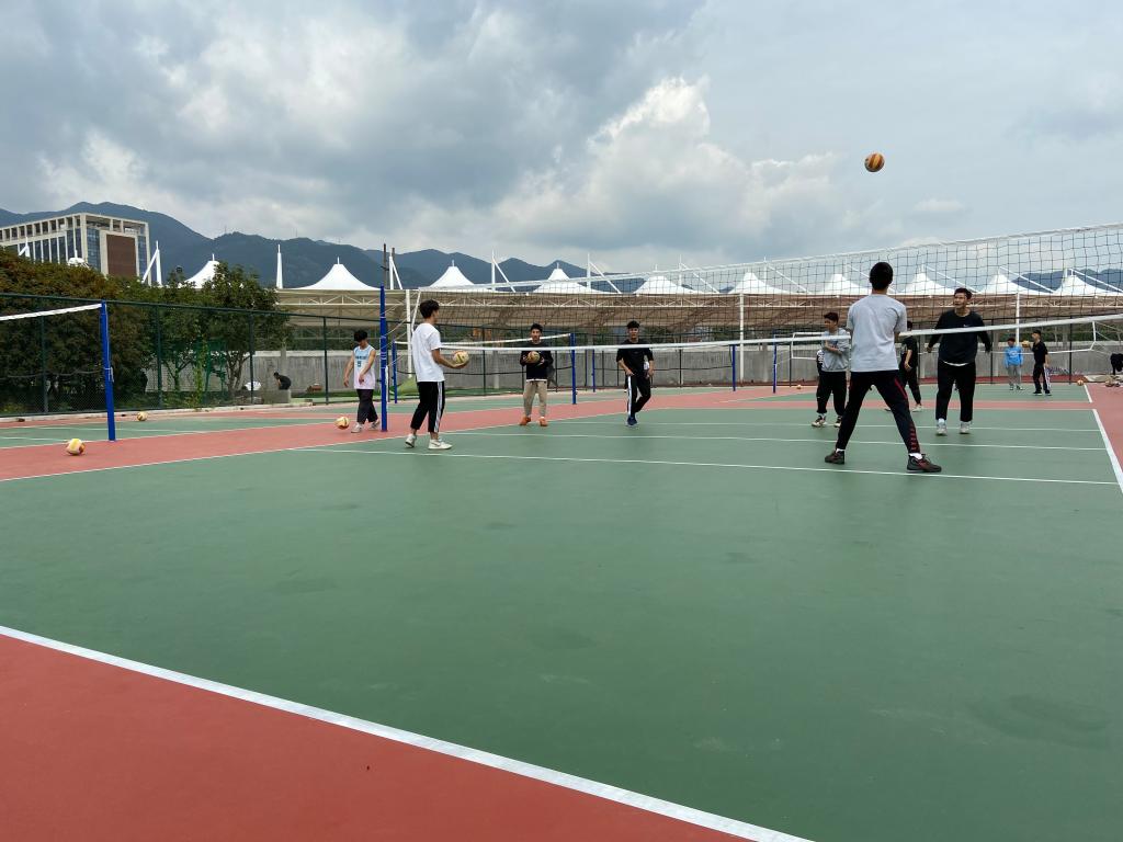 学生们在改造一新的排球场运动
