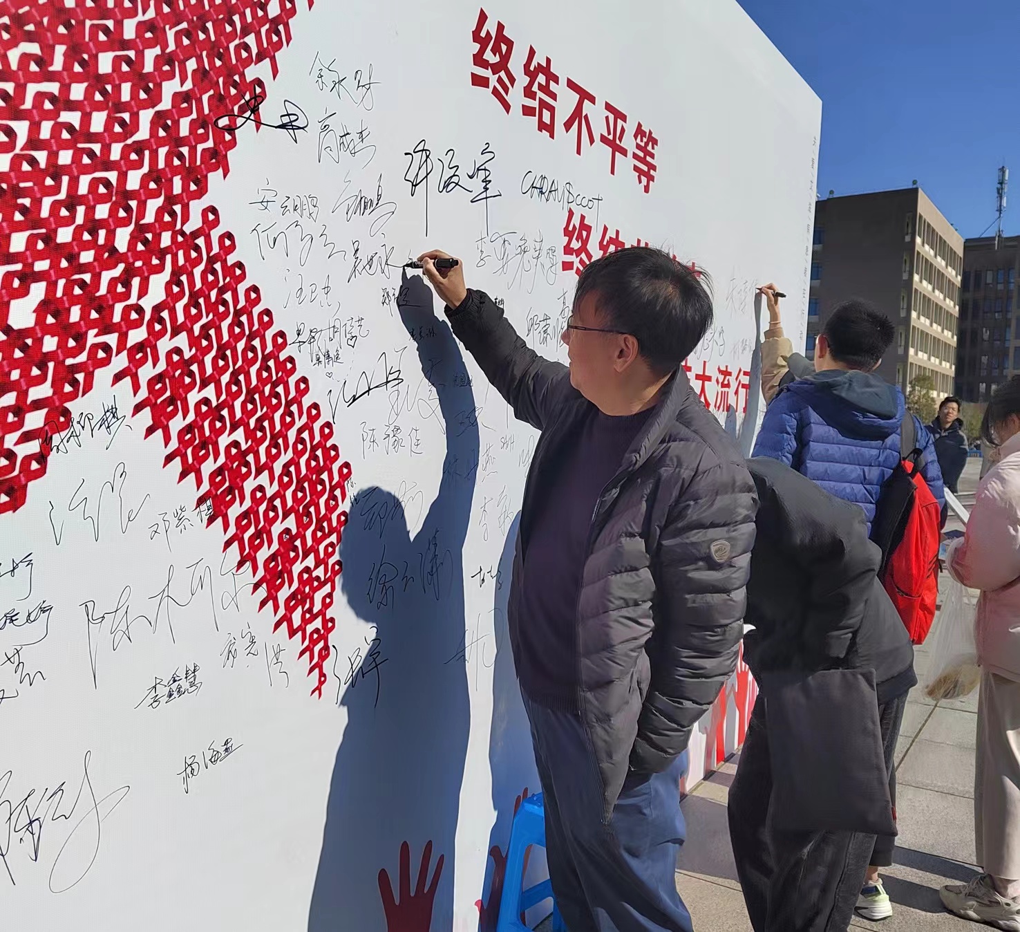 本次活动主要围绕知识宣传、防“艾”签名墙以及有奖答题等环节展开。活动伊始,校后勤服务管理处、疾病预防控制中心工作人员给每位参与者发放防艾知识的宣传手册,宣讲防“艾”知识,使同学们进一步认识和了解艾滋病的传播途径以及相关预防措施,更深刻地明白了要以正确的态度对待艾滋病人,不歧视艾滋病毒携带者。知识宣讲后,参加活动的师生纷纷在广场上巨大的防“艾”签名墙签名,以实际行动支持和践行防“艾”行动。最后,活动进行了有奖问答环节,参与者抽取题目进行有奖回答,赠送精美小礼品。活动上,工作人员还鼓励同学们关注防“艾”公众号,在了解更多预防艾滋病知识的同时,积极参与到知“艾”、防“艾”行动中。