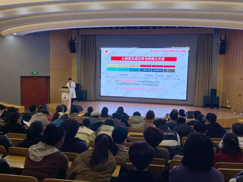 为进一步提升我校师生的应急救治能力,3月5日下午,校后勤处在大学生活动中心组织开展“‘救’在身边 守护生命”自动体外除颤仪(AED)实操培训。此次培训由学校医务室医生、浙江省红十字会二级应急救护师张晓优进行授课,学校师生近150人参加。